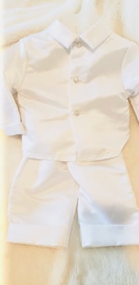 9-12M Boys white satin like button back shirt with integrated diamond pattern vest and tie and white satin like cuffed pants with elastic back waist. 100% Polyester. Dry Clean Only recommended. Perfect for Weddings, Christenings, Blessings and Baptisms. Gently Loved, Like New.