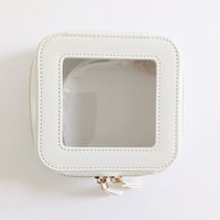 Cream/White approx. 5"x5", clear top, double zip gold hardware top closure makeup/accessory/travel case with attachable wrist strap. 100% PU. Perfect for small & travel size items for your purse or on the go! New w/tag!
