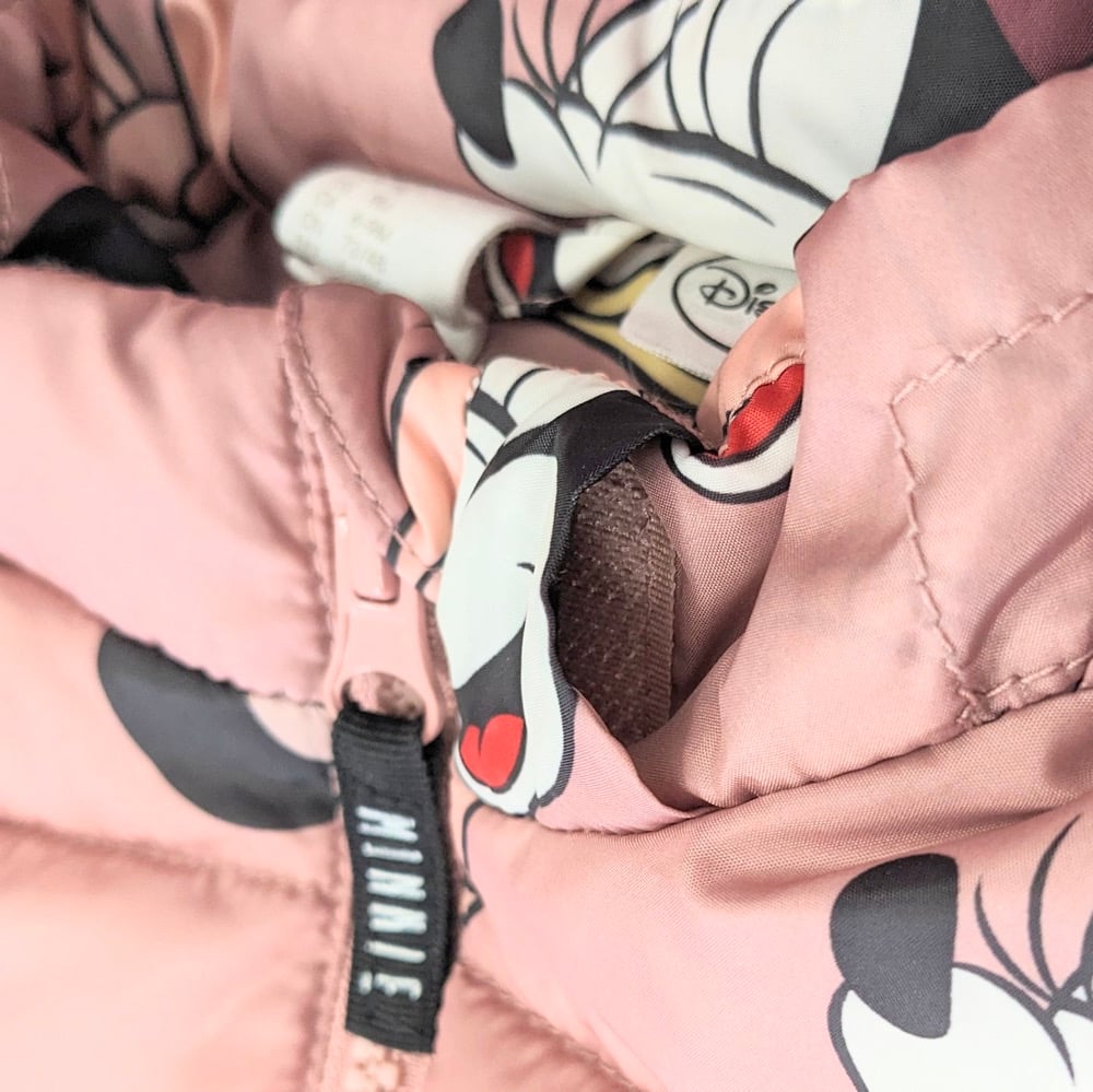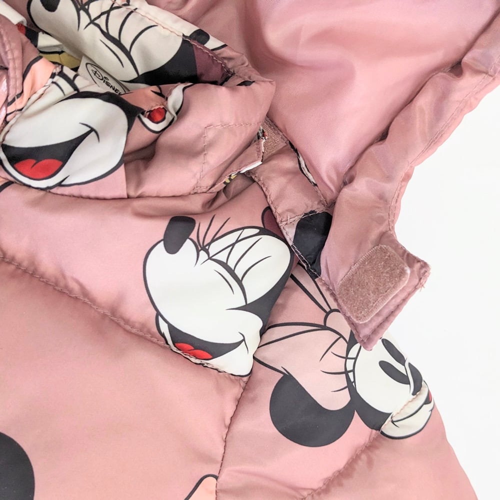 H&M Disney infant girls light pink/black/white, long sleeve, 9M, quilted, padded jacket in woven fabric with a Minne Mouse Bow printed pattern. Stand-up collar, detachable hood with Velcro attachment to collar for a snug fit around the neck and a zipper at front with anti-chafe chin guard. Concealed elastic at cuffs and hem. 100% Polyester. Gently Loved. Excellant Condition!
