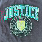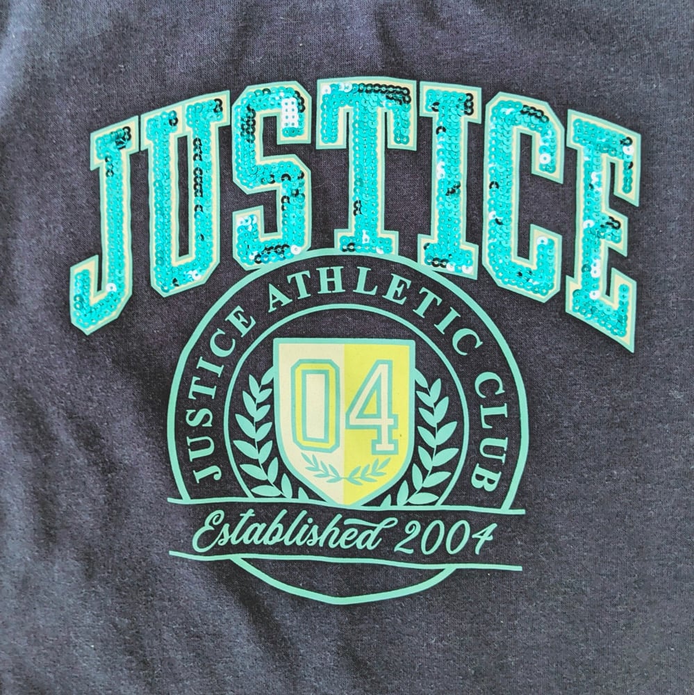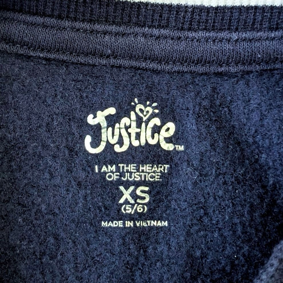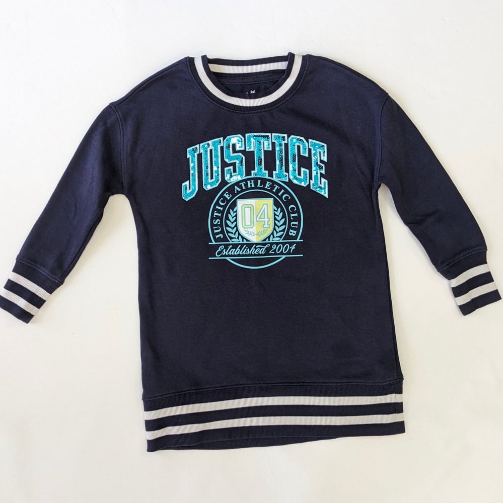 This stylish kids size XS(5/6), long sleeve sweatshirt/sweatshirt dress set from Justice includes a vibrant blue and green tie-dye hoodie with glitter Justice graphics on front and a classic navy blue, crew neck dress with sequin Justice graphics on front & rib cuffs. Perfect for keeping your child comfortable and trendy. 52% Cotton/48% Polyester. Gently Loved. Good Condition.