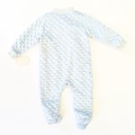 Kyle & Deena infant 3-6M footed, lined onesie with a gentle bear stitching on the front of this soft blue, cozy material onesie. This onesie has a soft bubble like material texture, Crew neck, Long sleeves and Front snap cross closure for easy off and on. Outer: 100% Polyester; Lining: 60% Cotton/40% Polyester. New w/Tag