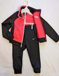 Nike girls 24M 2PC black and hot pink “Swoosh” embroidered Jacket and pants jogger set/track suit with inset pockets on jacket, stand up collar on jacket and comfortable elastic waist pants. 100% Nylon. Gently Loved, Like New.
