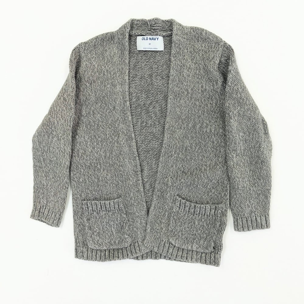 Old Navy girls size 4T elegant heather gray knit cardigan with open front with patch pockets, Rib-knit opening trim, cuffs & hem and long sleeves in a soft cotton yarn. 100% Cotton. Gently Loved. Good Condition.