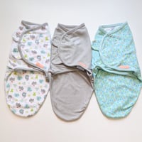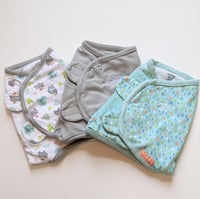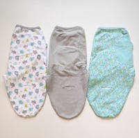 SwaddleMe Jungle Drops theme 3pk S/M. Fits babies 0-3M; 7-14lbs, up to 26 inches long. Adjustable wings that wrap around baby for the perfect fit. Hook and Loop closures, back slits allows for use in swings/bouncers (Do Not Use in Car Seats!). 100% Cotton. Gently Love. Great Condition.